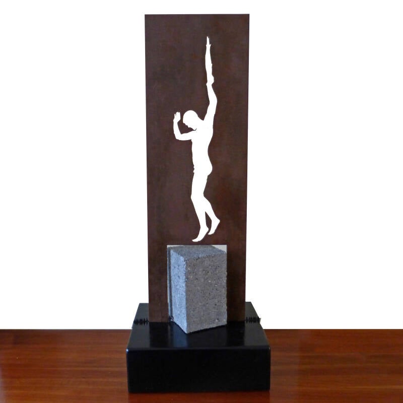 In mijn plan is de contour van het gestolen beeld uitgesneden uit een 4cm dikke plaat cortenstaal. De plaat over de originele sokkel geplaatst, waardoor het oude beeld weer zichtbaar gemaakt is. Tegelijk symboliseert het gat in de plaat de diefstal.